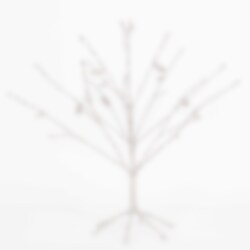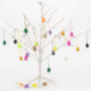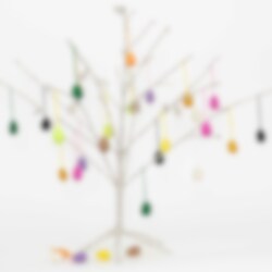 Ett sirligt träd att hänga påskhängen i. Trädet är tillverkat av ståltråd som har draperats med handgjort handtryckt bomullspapper.
