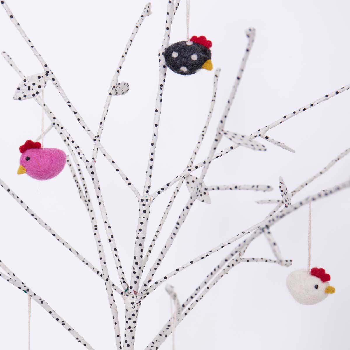 Påskkycklingarna är gjorda av handfiltad ull. Fina att hänga i påskriset eller som enstaka dekoration i t ex ett fönster! Priset är för fem kycklingar.