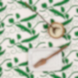 En handtryckt duk i en stadig bomullskvalitet. Mönstret är blocktryckt, vilket betyder att tyget trycks med en stor trästämpel, ett ca 15x20 cm stort handsnidat träblock.
