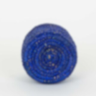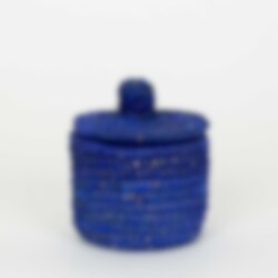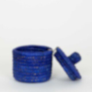 En liten färgstark korg med lock, som kan användas till förvaring av de allra minsta sakerna, som ringar eller små mynt. Korgen är handflätad av infärgade palmblad.