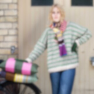 Modell bär en stickad ulltröja i vitt och grönt