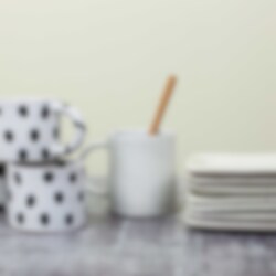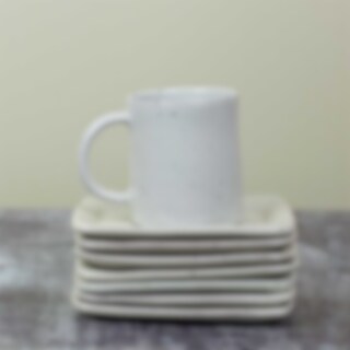 Earth-serien tillverkas av keramiker utanför Kathmandu, som framförallt arbetar med stengods. Den blanka glasyren är ljust grå med små oregelbundna svarta prickar.