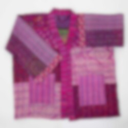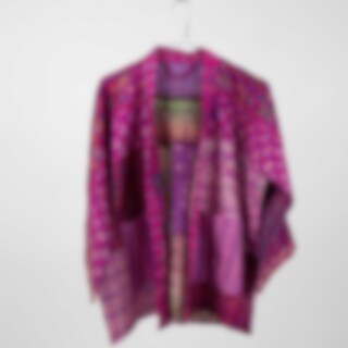 En färgglad kimono med två utanpå fickor, gjord av sidentyg. Alla Kimono är olika men snarlik den på bilden.