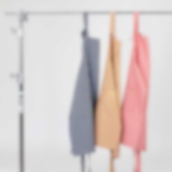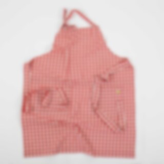 Förklädet, som är tillverkat av en stadig handvävd bomull, har två fickor fram och ett reglerbart band i nacken.