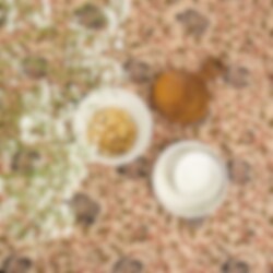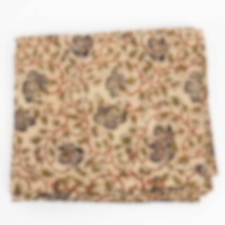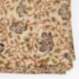 En duk tillverkad av traditionellt blommiga tyger s k "Kalamkari" från västra Indien. Duken har en påsydd bård i samma tyg för att ge den vidden 140 cm.