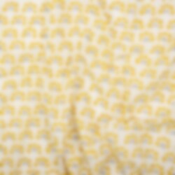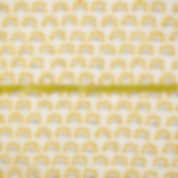 En tunn fin bomullskvalitet med mönster tryckt med handsnidade träblock, s k blocktryck eller block print. Produktionen är småskalig och helt hantverksbaserad.